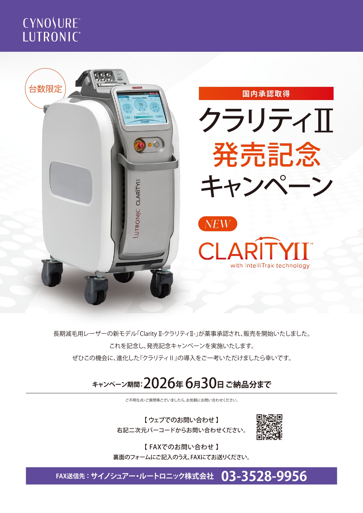 長期減毛用レーザーの新モデル「ClarityⅡ-クラリティⅡ-」が薬事承認され、販売を開始いたしました。これを記念し、発売記念キャンペーンを実施いたします。